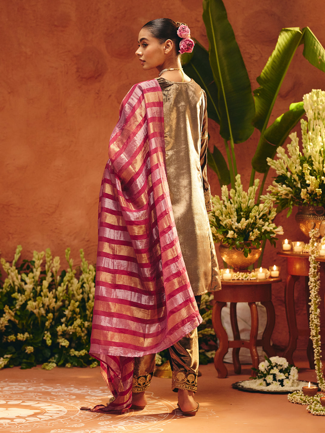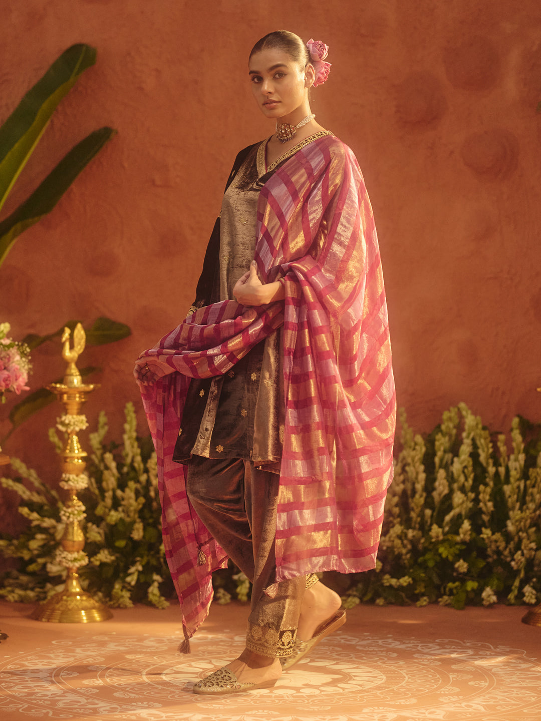 FIORRA Women Brown Ice Velvet Embroidered Kurta Set with Dupatta - S