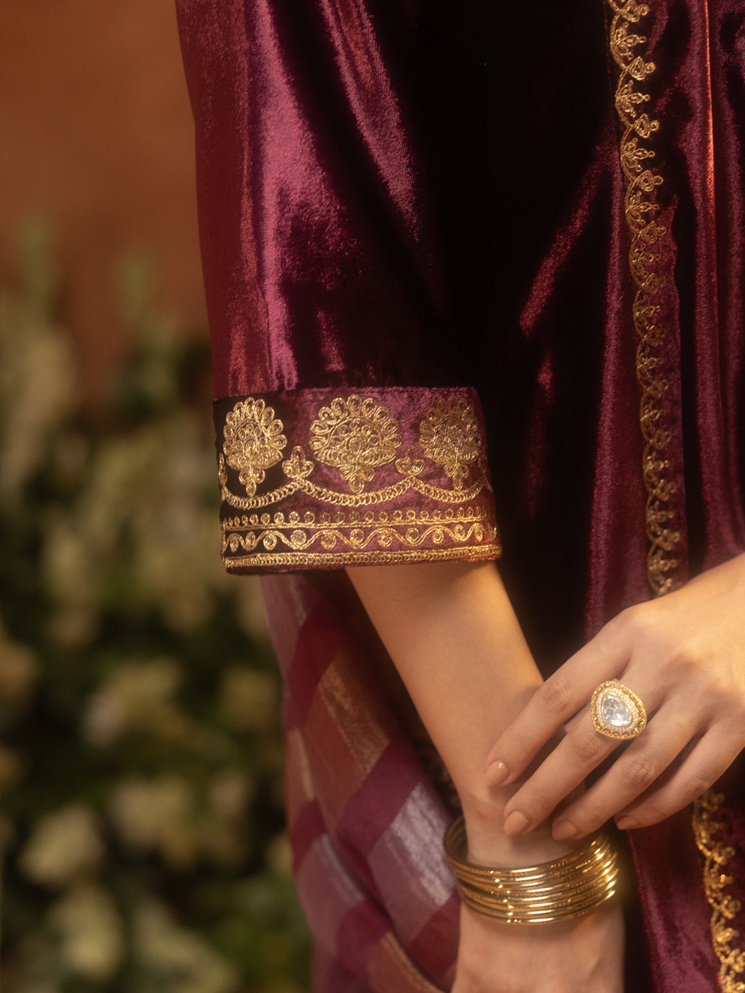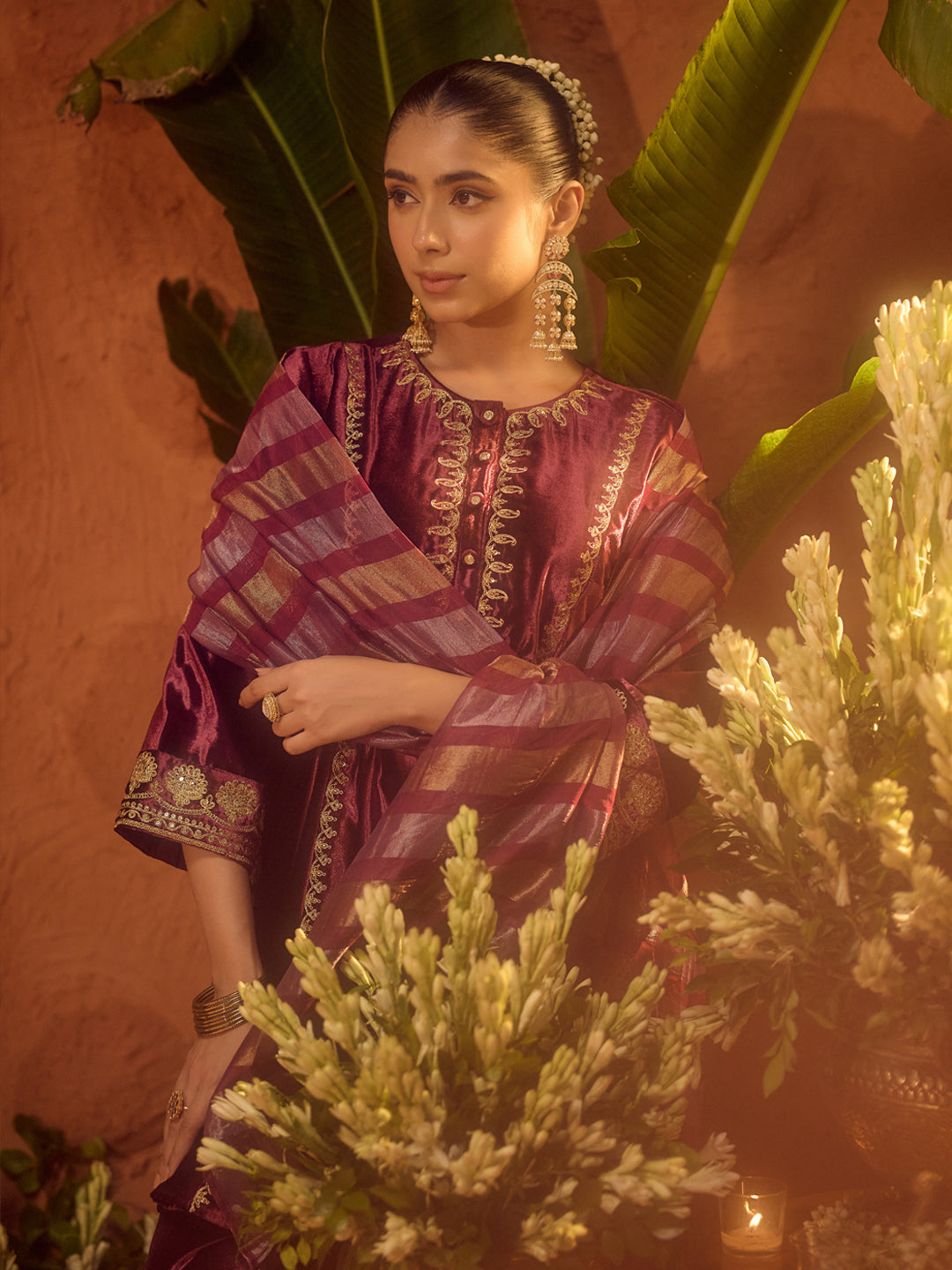 FIORRA Women Wine Ice Velvet Embroidered Kurta Set with Dupatta - S