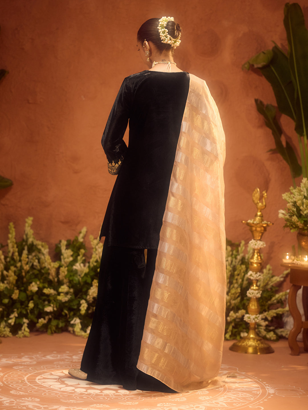 Elevate your festive and evening wardrobe with this luxurious Black Ice Velvet kurta set from FIORRA. Crafted in rich ice velvet fabric, the kurta features intricate gold-toned embroidered detailing along the V-neckline and delicate scattered motifs throughout the body, lending it a graceful and elegant appeal. The straight silhouette with ¾ sleeves ensures a refined festive look, while the matching ice velvet bottom adds comfort and coordinated charm. Completing the ensemble is a soft golden-beige organza dupatta with subtle sheen, adding a touch of sophistication and contrast to the deep black kurta set.